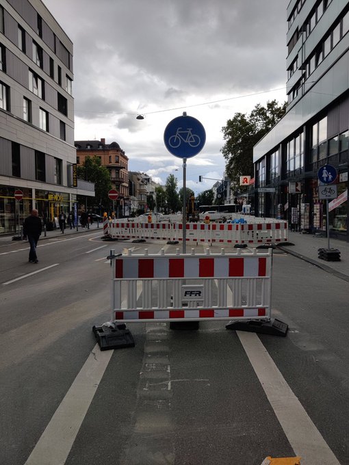 ![]() Immer wieder schön anzusehen wenn ein anderer Radweg plötzlich zum gemeinsamen Geh- und Radweg umfunktioniert wird und dadurch eine Benutzungspflicht (Zeichen 240) simuliert. Dieser kann leider nicht gefolgt werden, da der Restgehweg an der Baustelle vorbei bis zur Unkenntlichkeit geschrumpft wurde und jeder Radfahrer absteigen müßte. Freilich wird hinter der Baustelle „vergessen“, die Benutzungspflicht wieder aufzuheben. -------------------- Da issn RATT-WEEECH! https://up.picr.de/48359390oc.png