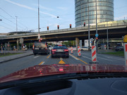 ![]() Die vierspurige Richtungsfahrbahn ist baustellenbedingt zur Hälfte gesperrt. Also verbleibt nur die linke Linksabbiegerspur, und der Geradeausverkehr wird über die eigentliche rechte Linksabbiegerspur geführt (ein entsprechender gelber Pfeil wurde brav aufgebügelt). Trotzdem ist es irgendwie nicht so ganz ordentlich geworden |