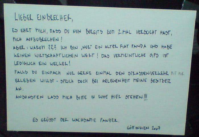 Als ich nach rechts aus dem Fenster blickte, wurden diese Blicke durch 2 weiße Leuchten erwidert. 1 Sekunde später wurde ich dann richtig durchgeschüttelt. Hatte der querparkende Sprinter doch tatsächlich den "kleinen" Swift übersehen und ist einfach mal rückwärts aus der Parklücke gefahren. ![]() Da der Fahrzeugkontakt durchaus "intensiv" war, hatte ich im ersten Moment wirklich Schlimmes befürchtet. Also Warnblinker an und ausgestiegen und dann kam mir auch schon der Fahrer des Sprinters entgegen: "Ja den hab ich nicht gesehn, der is so klein ![]() Ich fand das erstmal gar nicht so lustig und hatte mich schon mental auf den Anruf bei der Polizei vorbereitet. Jedoch konnte ich meinen Blicken kaum trauen: Kein Schaden! ![]() Wie war das möglich? Der Auspuff des Sprinters ist direkt auf mein rechtes Hinterrad getroffen, bzw. die Radkappe - und nicht mal die ist beschädigt. Wäre ich nur 20 cm weiter vorne oder weiter hinten gestanden, wäre das mit ziemlicher Sicherheit ein Schaden im drei- bis vierstelligen Eurobereich gewesen. So haben wir uns dann doch mit einem kleinen Schrecken aber ohne Streit getrennt. ![]() |