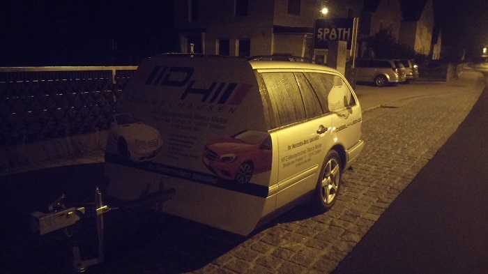 Der Anhänger ist an sich unbrauchbar und nur als Showgerät zu verwenden. Die Achse ist naturgemäß zu weit hinten, die Deichsellast wird da sehr hoch. Da hilft nur mehr, Bleiplatten in den Kofferraum zu geben.