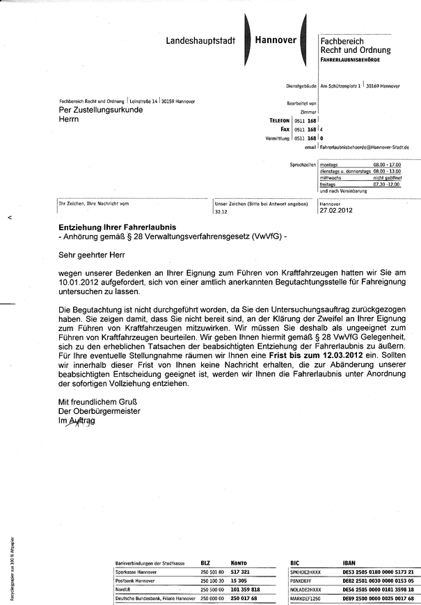 Nach den Plänen von Ramsauer wären es vermutlich 10 Jahre ab Datum Strafbefehl. Zitat @ Uwe: Ich habe beim MPI angerufen und wollte einen Termin machen, der im Juni/Juli/ August gelegen hätte. So weit in die Zukunft können/wollen die aber nicht planen. Eine MPU innerhalb der Frist wäre aber mMn rausgeworfenes Geld. Daher meinte die Dame dann, dass sie die Akte an die FEB zurück schickt. So könnte man die "Rückziehung des Untersuchungsauftrags" umschreiben. Das war sicherlich ungeschickt von Dir. Wie Kai schon geschrieben hat, hättest Du einen Termin innerhalb der Frist vereinbaren und diesen dann absagen können. -------------------- "Alle Mitgliedstaaten hätten Grund sich zu beklagen. Skouris betont, dass gerade dies beweise, dass der EuGH seine Arbeit gut mache."