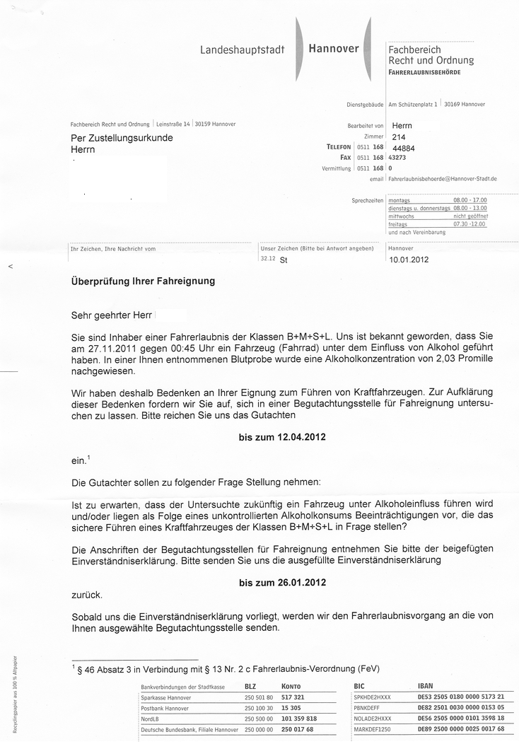 Das ist jetzt harter Tobak. Vorgestern erst den Strafbefehl erhalten, heute schon die Aufforderung der FEB. Die Frist für die Abgabe eines Gutachtens verstreicht am 12.4.12.